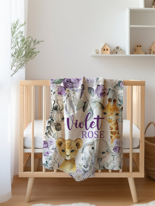 Personalized Safari Animals Baby Girl Blanket with Purple Lavender Flowers