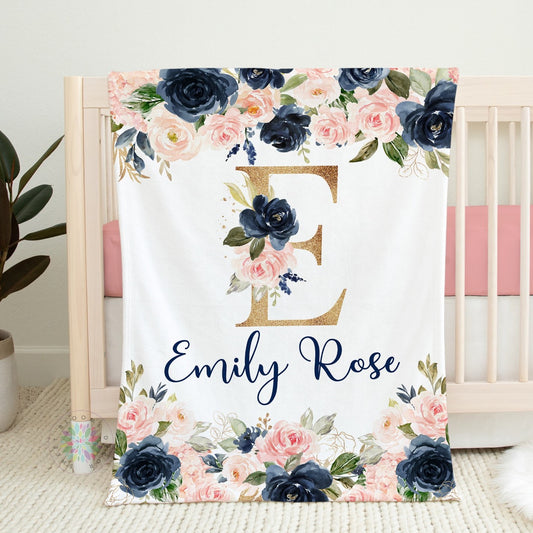 Blush Pink Navy Watercolor Floral Baby Girl Nursery Bedding Set