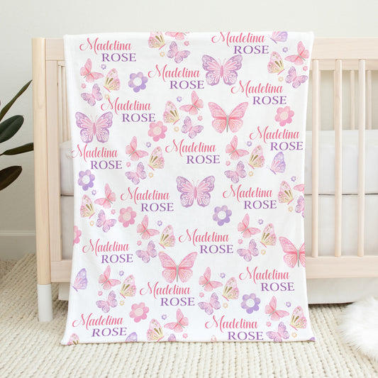 Personalized Pink Purple Butterfly Floral Baby Girl Blanket