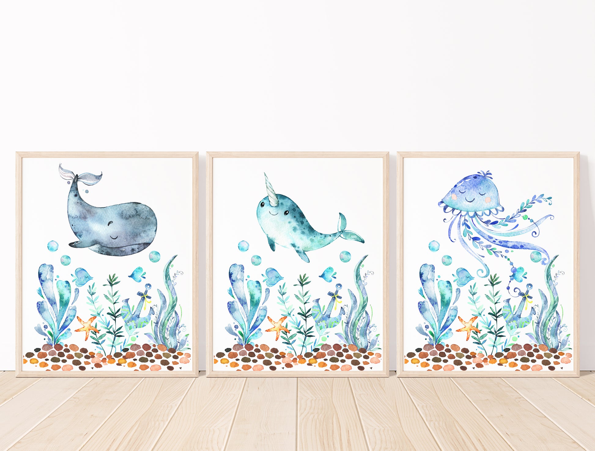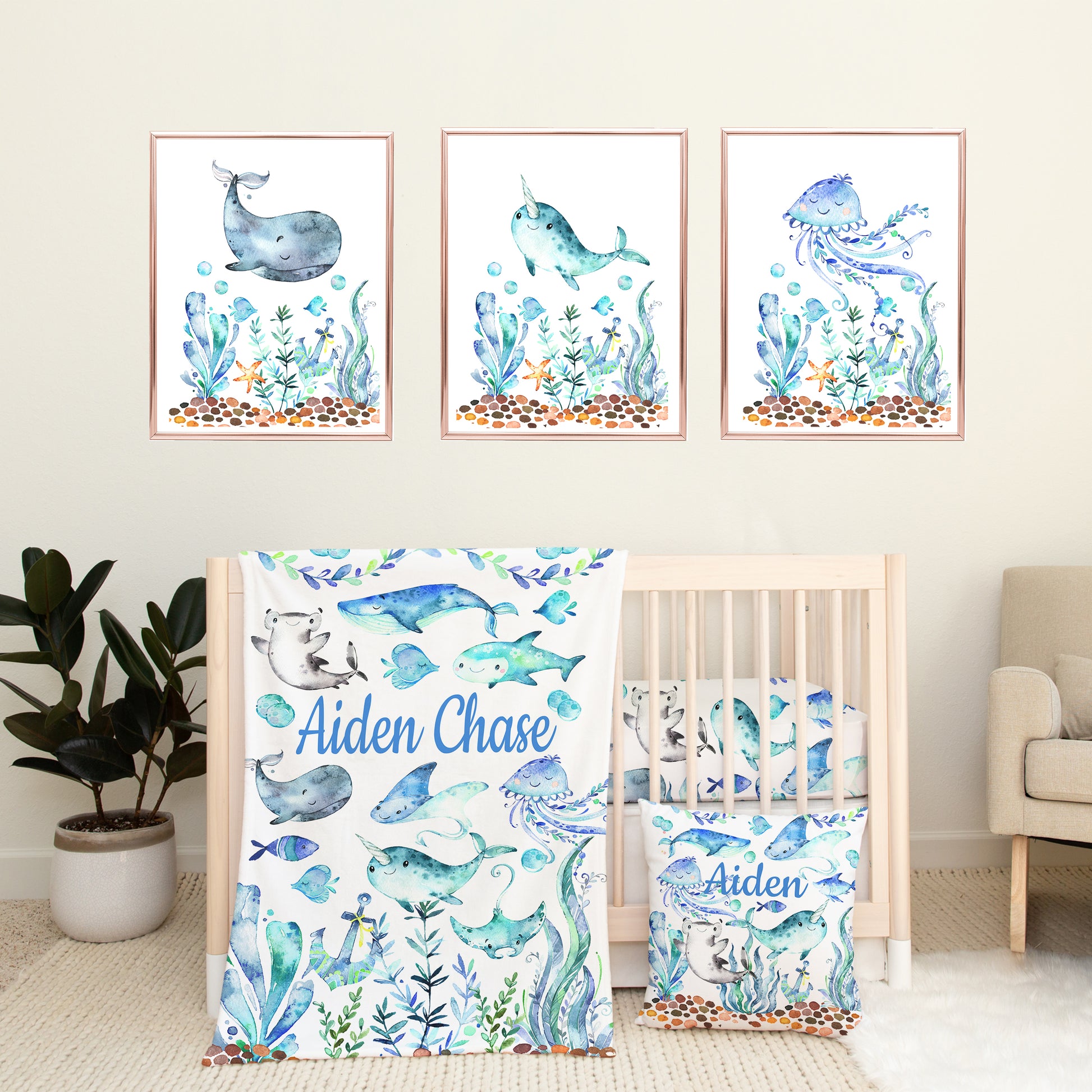 Create a cozy underwater world for your little one with the Sea Animal Nursery Set. This charming collection includes a soft minky blanket, a matching crib sheet, playful wall art prints, and a cute throw pillow—all adorned with blue-green watercolor whales, jellyfish, octopuses, sharks, and seaweed. Perfect for sparking imagination and adding a splash of color, this set brings the magic of the sea right into your baby’s nursery.